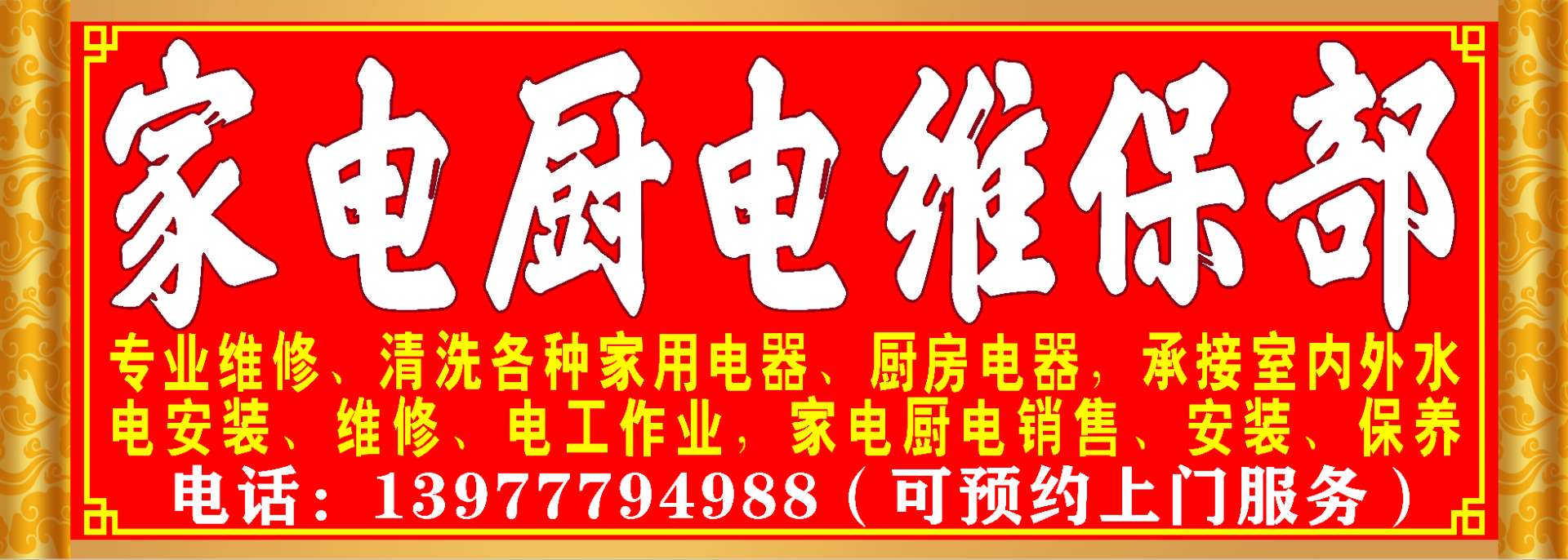 专业维修各种家用电器,厨房电器,室内外水电安装,维修,电工作业。清洗油烟机,洗衣机,空调等。可以预约上门服务。