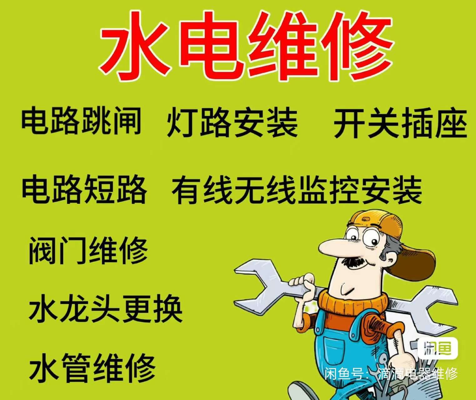 水电工上门维修,水电维修服务 ,开关更换,插座安装增加,电路改造,电路跳闸,电路故障排除,水管维修,水管更换改造,水龙头更换,软管更换,角阀更换,卫浴洁具安装,安装地漏 面盆,五金挂件 软管 三角阀 水箱 浴霸安装与维修,安装镜子,置物架,晾衣架,安装射灯,灯带,布线布管,疏通管道,改地漏,维修马桶更换洁具