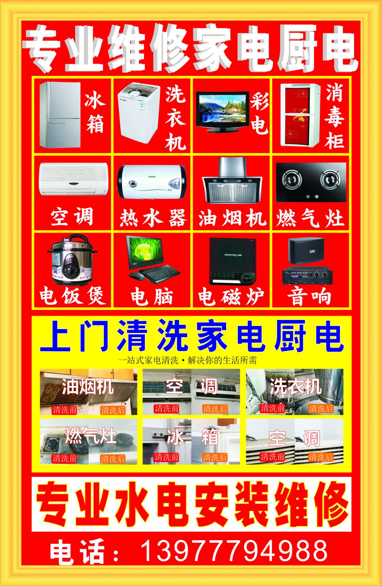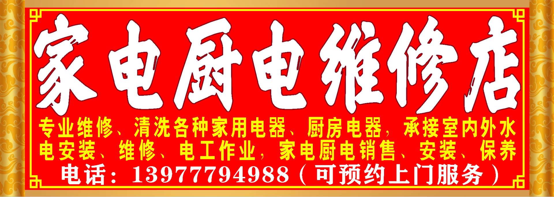 - 空调维修 、 热水器维修 、 洗衣机维修 、 电视机维修 、 冰箱维修 、 油烟机维修 、 燃气灶维修 、 其他家电维修