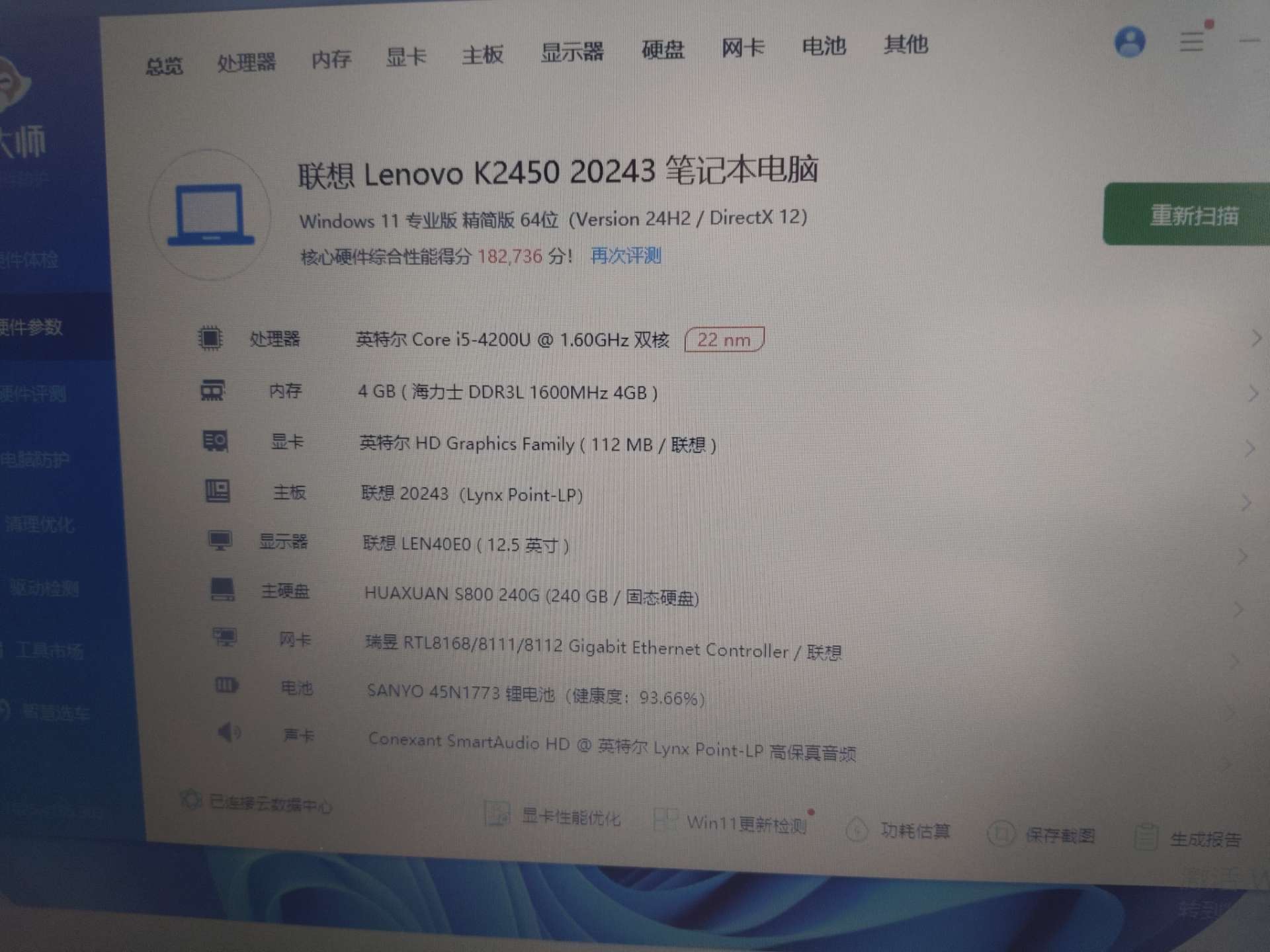 联想K2450笔记本电脑,i5-4200U处理器,4GB内存,240G固态硬盘。12.5英寸屏幕,HD显卡。电池健康度93%,机器功能完好。外观成色如图,有正常使用痕迹。二手商品售出不退不换,需要的朋友私聊。