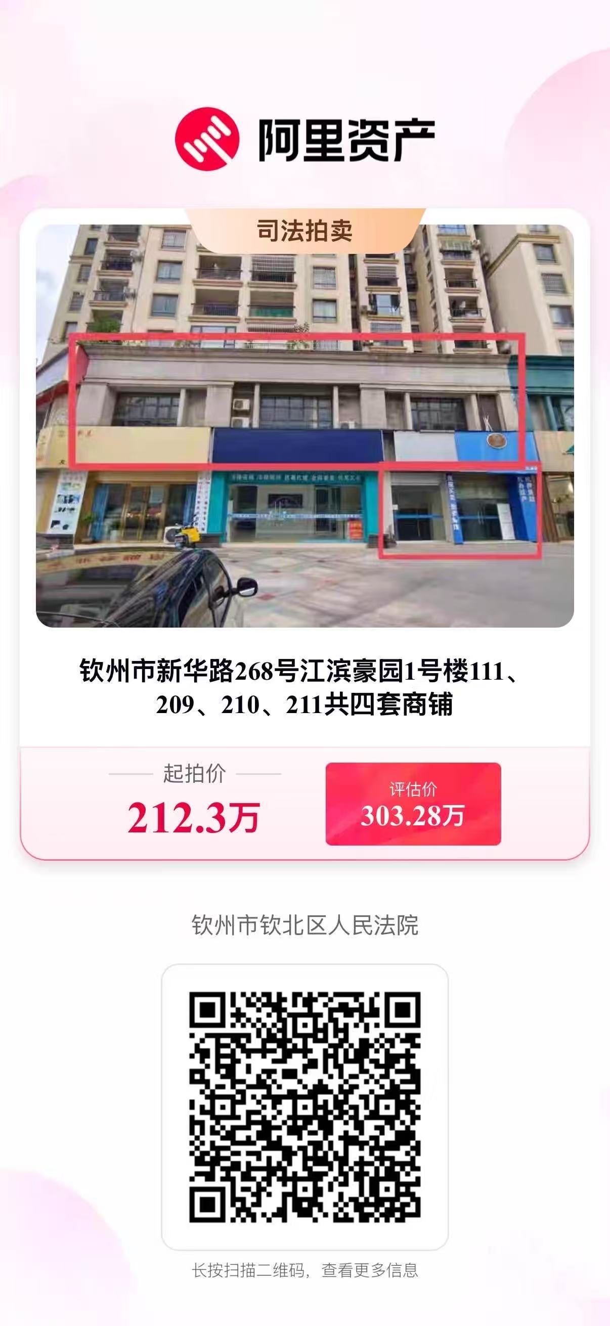 江滨豪园临街商铺,465.79平,起拍价212.3万,起拍单价约4558元/平,11月19号开拍