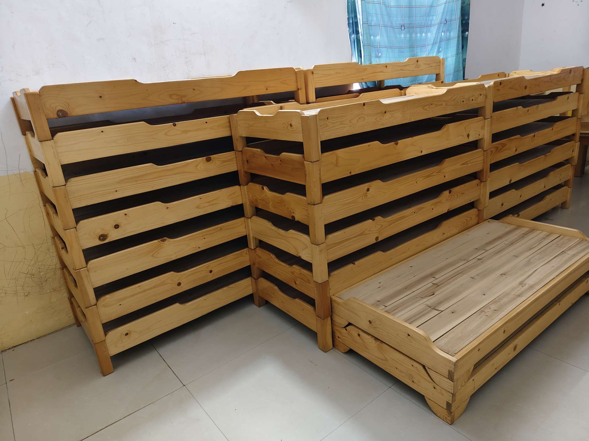 出售一批幼儿园午睡床是松木和杉木做的质量很好,有1百多张,规格1.3米❌0.6米,9成新,50元一张,要多可适当优惠点,欢迎来看货,有时候可以顺路帮拉出钦州免运费。还有一些幼儿园用的桌子是实木的适合给小孩子用来写作业,凳子是胶凳,不是那种普通的便宜货哦,还有书包柜,都是质量很好的都是9成新,电视机,木马,蹦蹦床等也同步出售,合适用的老板请联系我!