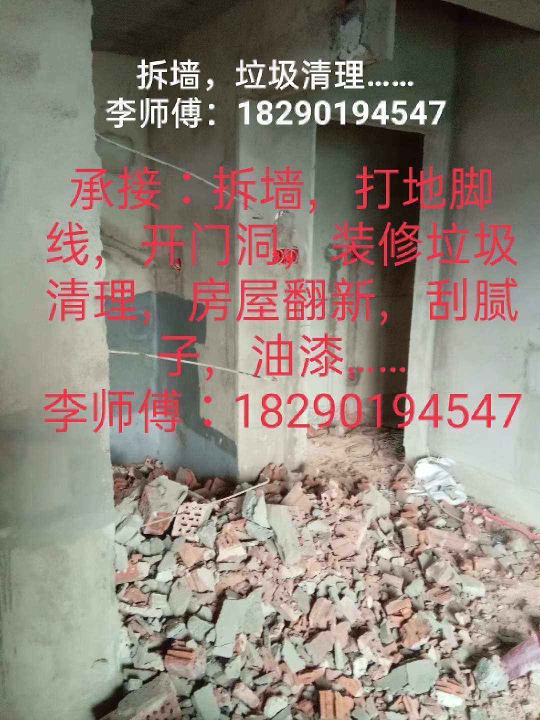 承接:拆墙,刮腻子,油漆,旧墙翻新,卫生间翻新,装修垃圾清理……李师傅:18290194547