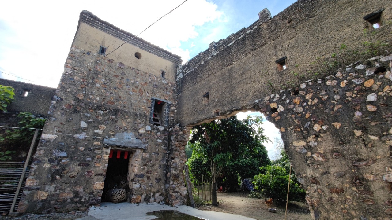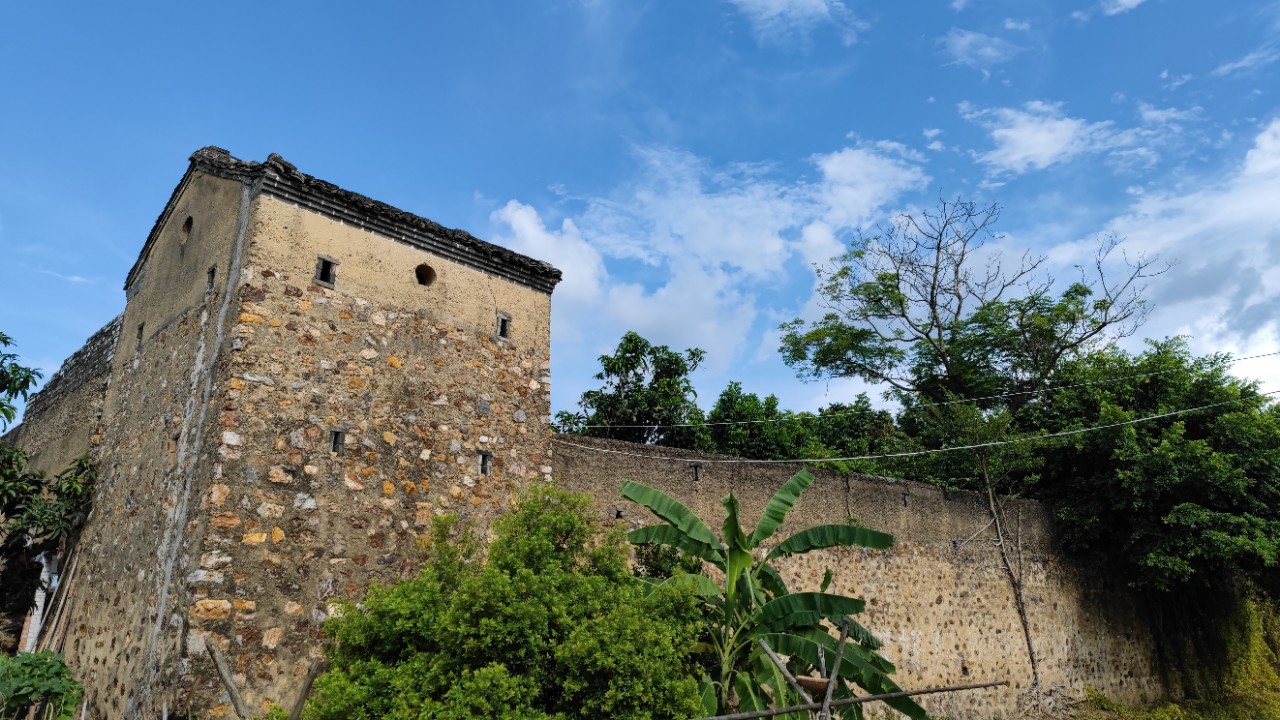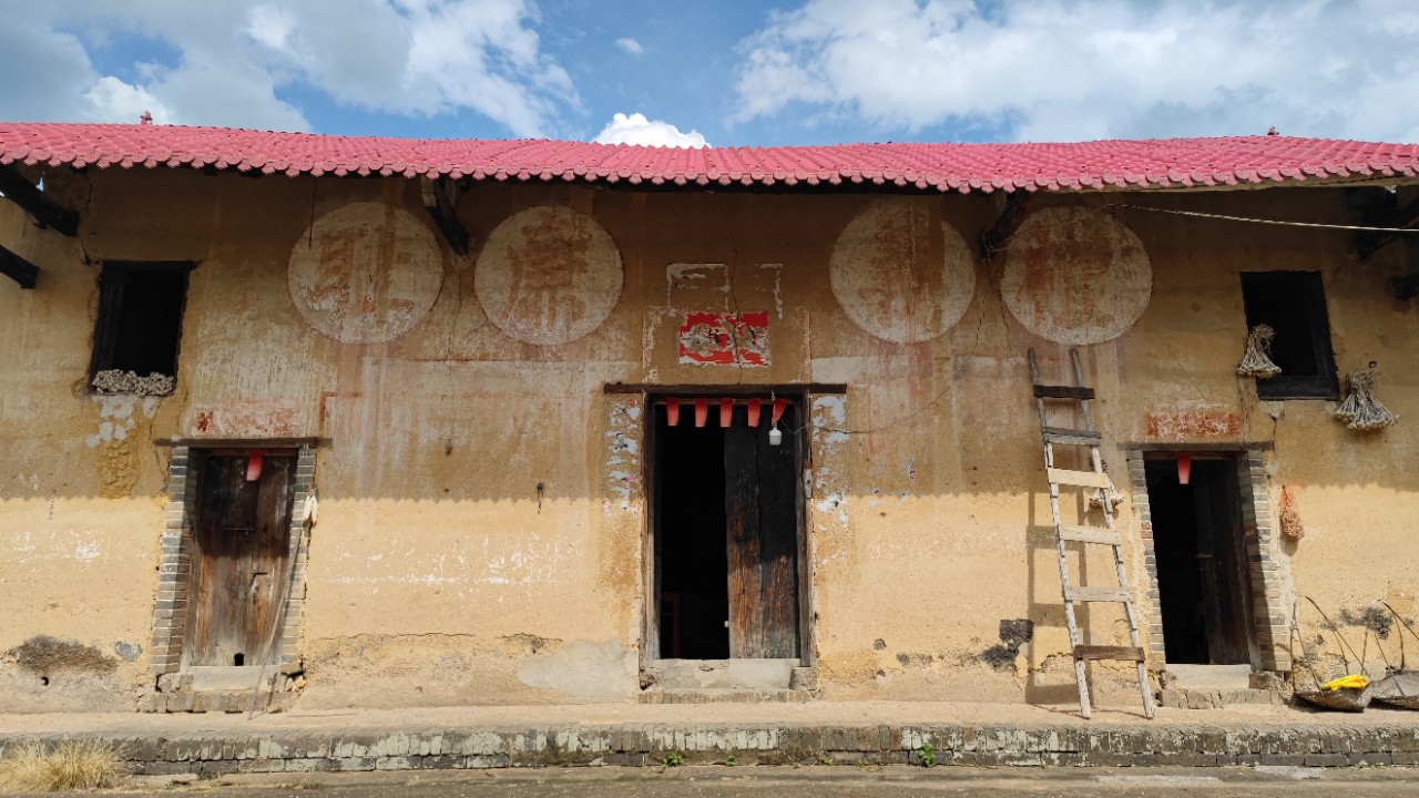 来到小董那兰村,想找一些抗战时的旧迹,但大多数老房子已经倒塌了,只拍到图一图二的少许遗迹,据村中老人家说这里是当年粤军将领张之英的老家,当年村中的民众战斗力很强大,有部队在村里训练住宿的,墙上的字迹就是当时留下来的。